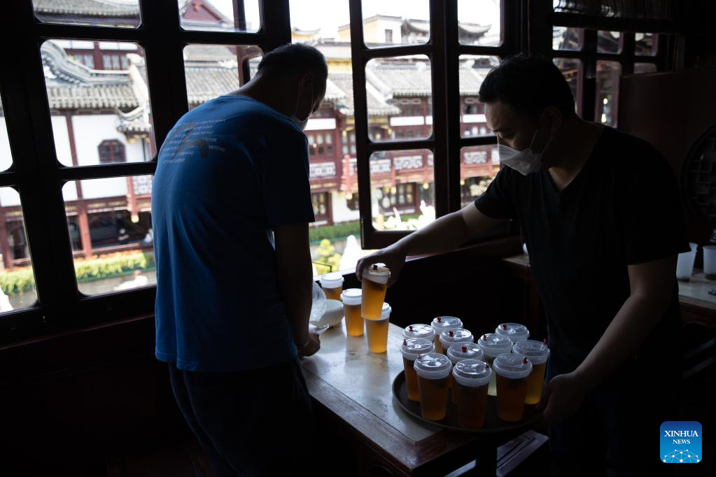 Staff members prepare take-away tea beverages at a teahouse in the Yuyuan Garden Mall in Huangpu District of Shanghai, east China, May 31, 2022. (Xinhua/Jin Liwang)