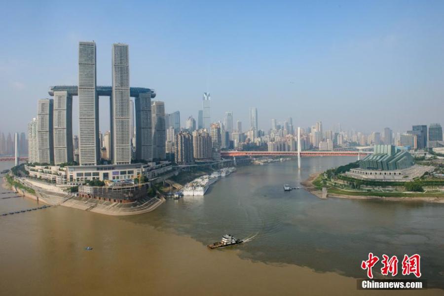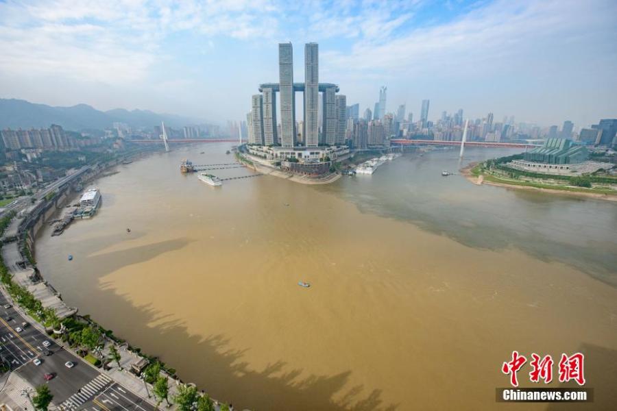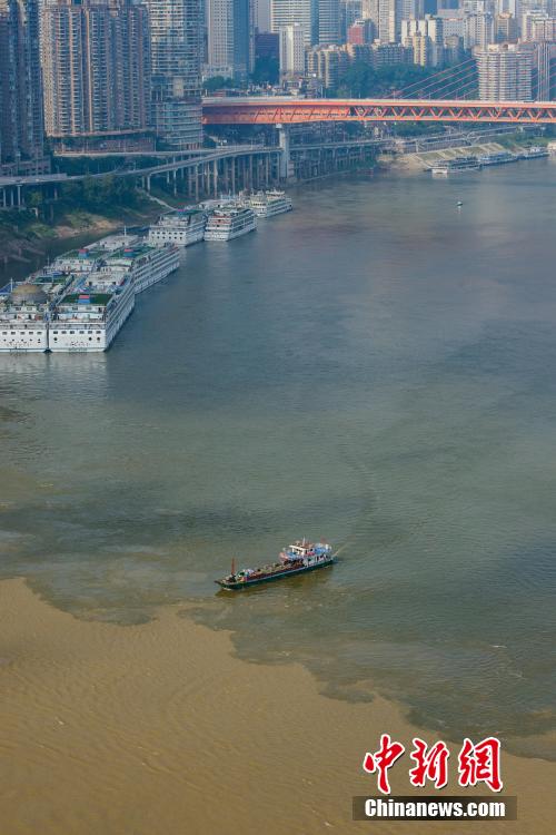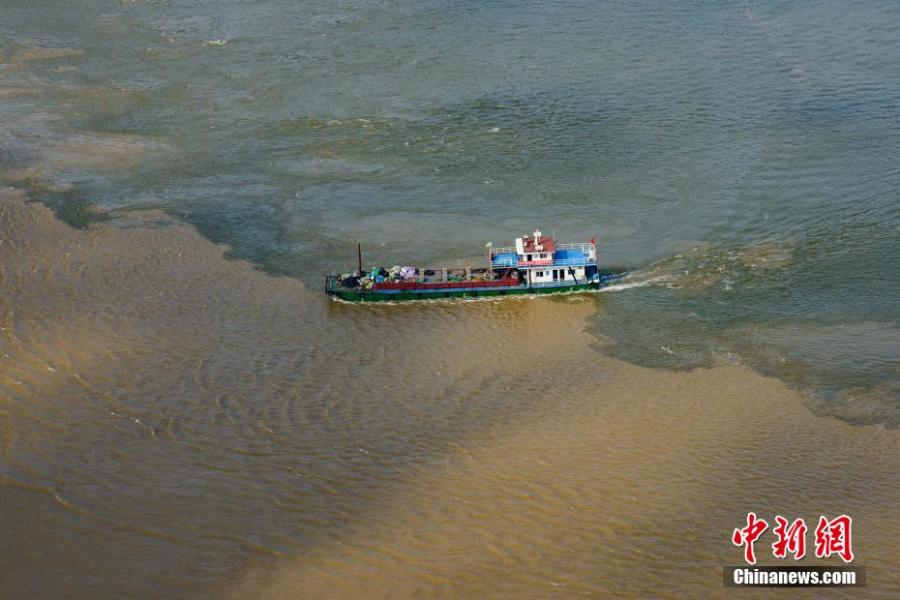The confluence of the Yangtze River and Jialing River reveals a stunning scene, as the two sources of water reflect totally different colors in Chaotianmen port, Chongqing, May 31, 2022. (Photo: China News Service/He Penglei)