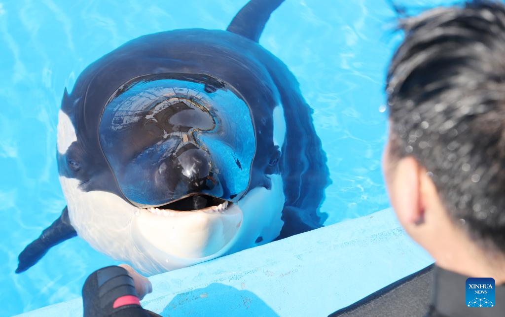 A killer whale calf interacts with a staff member at the Shanghai Haichang Ocean Park in east China's Shanghai, May 31, 2022.