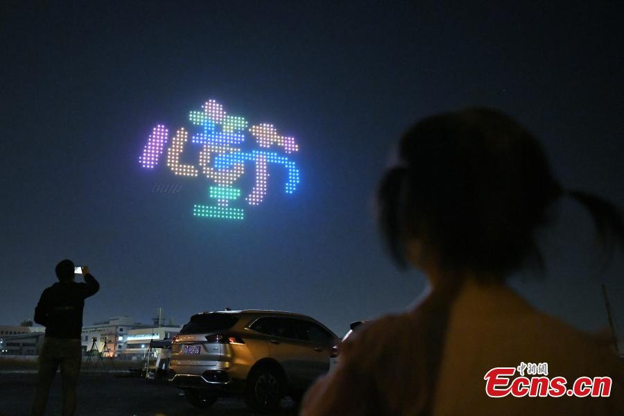 Illuminated drones stage a light show to celebrate the Children's Day in Tianjin, May 31, 2022. (Photo: China News Service/Tong Yu)