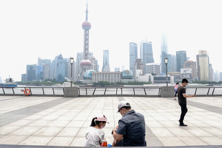 People sit on a viewing platform at the Bund area in east China's Shanghai, June 1, 2022. (Xinhua/Ding Ting)
