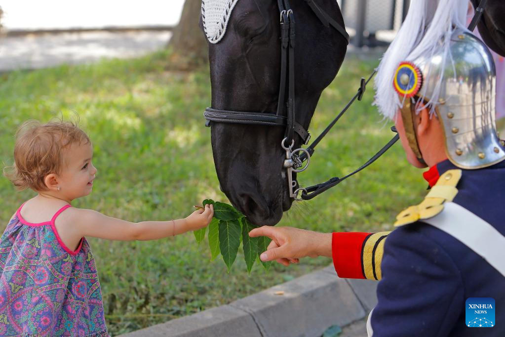 A child tries to feed a parade horse during an event marking International Children's Day in Bucharest, Romania, on June 1, 2022. (Photo by Cristian Cristel/Xinhua)