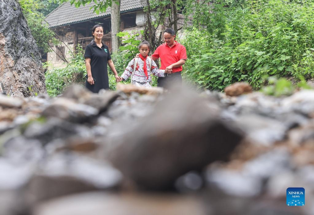 Yang Yameng are seen with her parents in Huawu Village of Xinren Miao Township, Qianxi City, southwest China's Guizhou Province, June 1, 2022. Yang Yameng is a pupil living in Huawu Village in southwest China's Guizhou Province. Her hometown was once an extremely impoverished village. In recent years, with a package of supporting policies, poverty has been eliminated in the village through boosting crop and animal husbandry industries as well as promoting tourism, and villagers already have got access to roads, water supply, electricity connections and internet. Yang Yameng's families have ridden the wave of agritourism and started a homestay business. Just like Yang's family, migrant workers who once left for a better life have gradually chosen to return to Huawu, engaging themselves in cooperatives or homestay businesses. (Xinhua/Ou Dongqu)