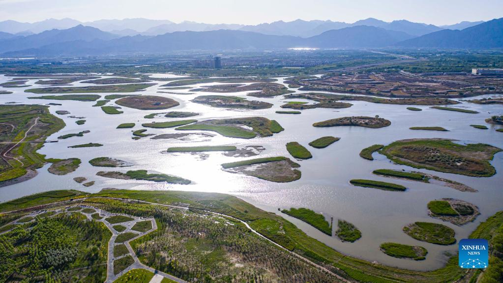 Aerial photo taken on May 30, 2022 shows the scenery of Xinghai Lake in Shizuishan City, northwest China's Ningxia Hui Autonomous Region. (Xinhua/Yang Zhisen)