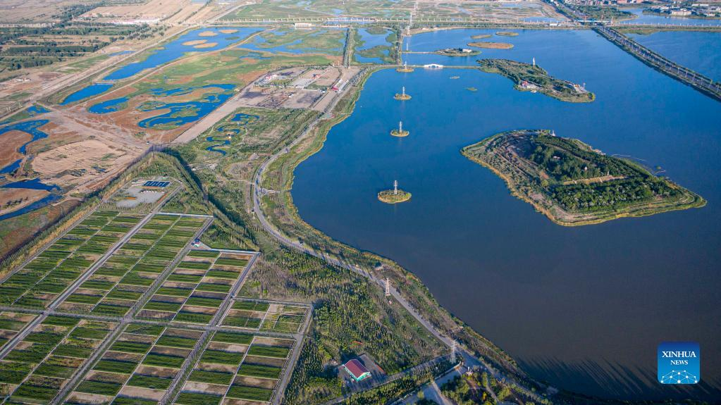 Aerial photo taken on May 30, 2022 shows the scenery of Xinghai Lake in Shizuishan City, northwest China's Ningxia Hui Autonomous Region. (Xinhua/Yang Zhisen)