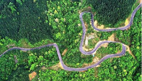Photo taken on April 25, 2022 shows an aerial view of a country road in Rongjiang county, Qiandongnan Miao and Dong autonomous prefecture, southwest China’s Guizhou province. (People’s Daily Online/Li Changhua)
