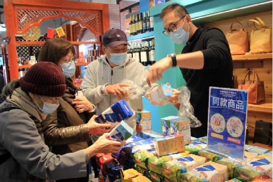 Tourists purchase commodities introduced into China through the China International Import Expo (CIIE) at a “CIIE bazaar” on Nanjing Road Pedestrian Walkway, east China’s Shanghai municipality, Nov. 8, 2021. (People’s Daily Online/Li Lizhen)