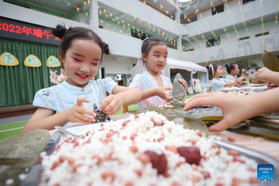 Children learn to make Zongzi, a pyramid-shaped dumpling made of glutinous rice wrapped in bamboo or reed leaves, on the eve of the Dragon Boat Festival in Daying County of Suining City, southwest China's Sichuan Province, June 2, 2022. The Dragon Boat Festival will fall on June 3 this year. (Photo by Liu Changsong/Xinhua)