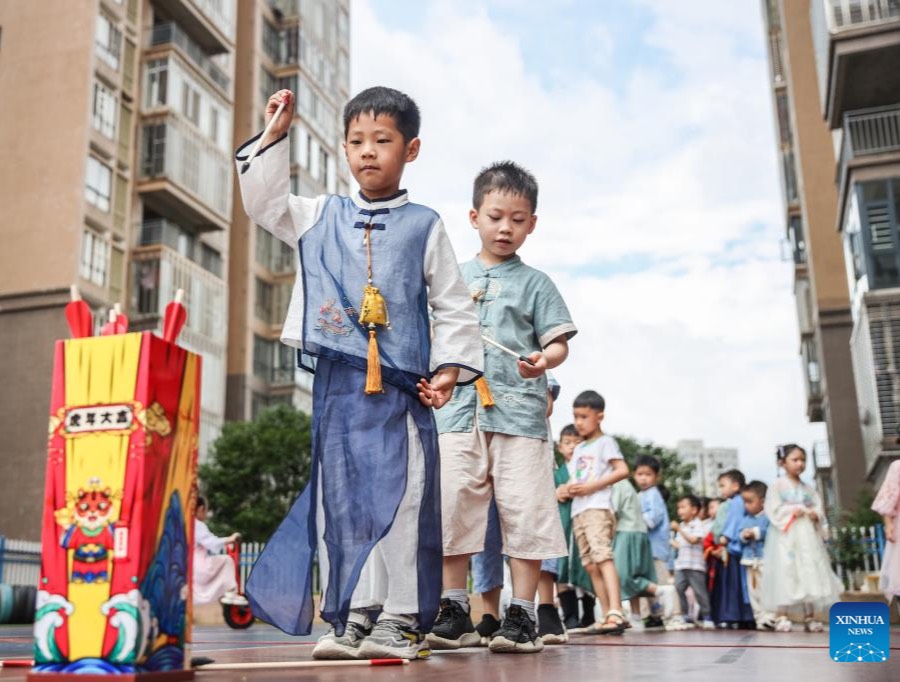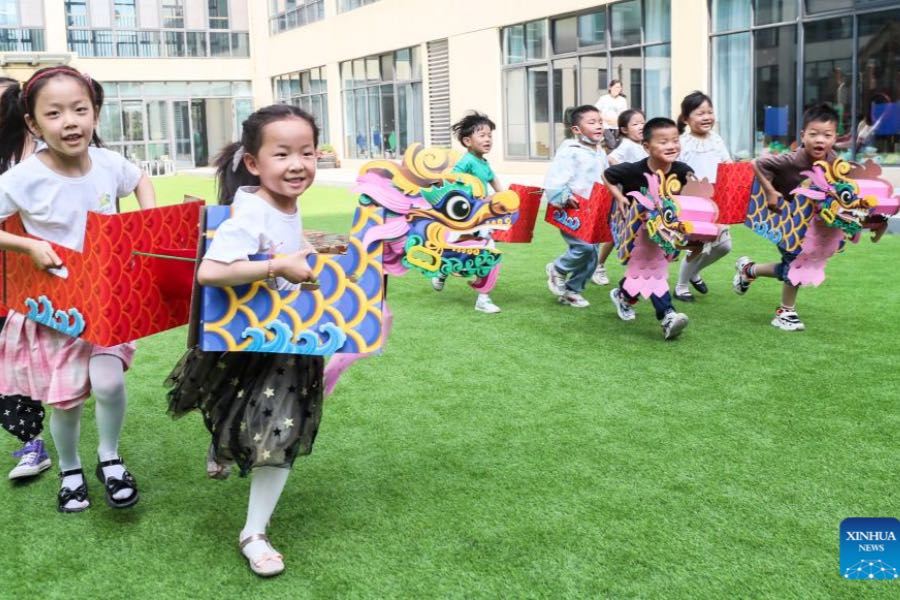 Children equipped with dragon-boat-shaped paper fits take part in a fun game on the eve of the Dragon Boat Festival at a community in Huai'an City, east China's Jiangsu Province, June 2, 2022. The Dragon Boat Festival will fall on June 3 this year. (Photo by Zhao Qirui/Xinhua)