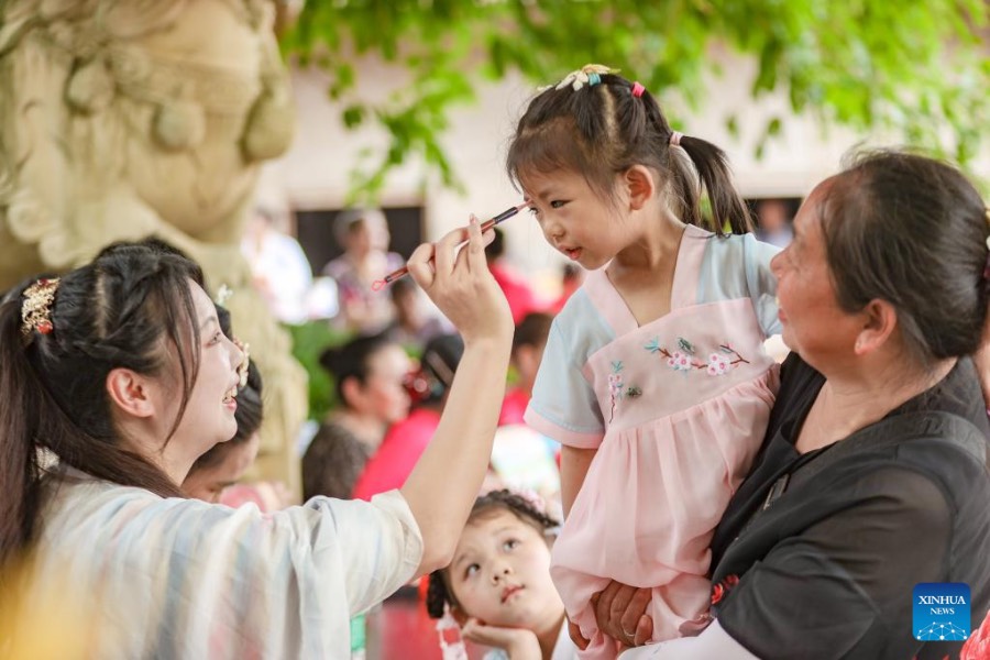 A local volunteer marks a girl on her forehead with a brush dipped in realgar to ward off evil spirits as a traditional custom during the Dragon Boat Festival at Guangjing Village of Renhe Township in Shehong City, southwest China's Sichuan Province, June 2, 2022. The Dragon Boat Festival will fall on June 3 this year. (Photo by Liu Changsong/Xinhua)