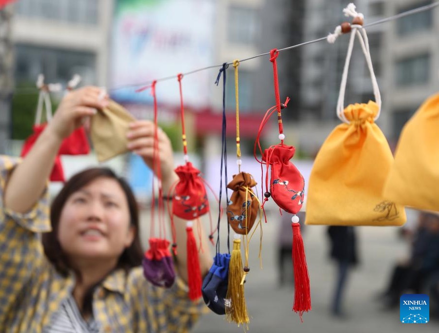 A staff member decorates the community with sachets to celebrate the upcoming Dragon Boat Festival in Qixingguan District of Bijie City, southwest China's Guizhou Province, June 2, 2022. The Dragon Boat Festival will fall on June 3 this year. (Photo by Han Xianpu/Xinhua)