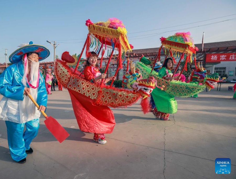 Folk artists perform traditional dance to celebrate the upcoming Dragon Boat Festival in Yangjiazhuang Village, Cuijiazhuang Township of Zunhua City, north China's Hebei Province, June 2, 2022. The Dragon Boat Festival will fall on June 3 this year. (Photo by Liu Mancang/Xinhua)
