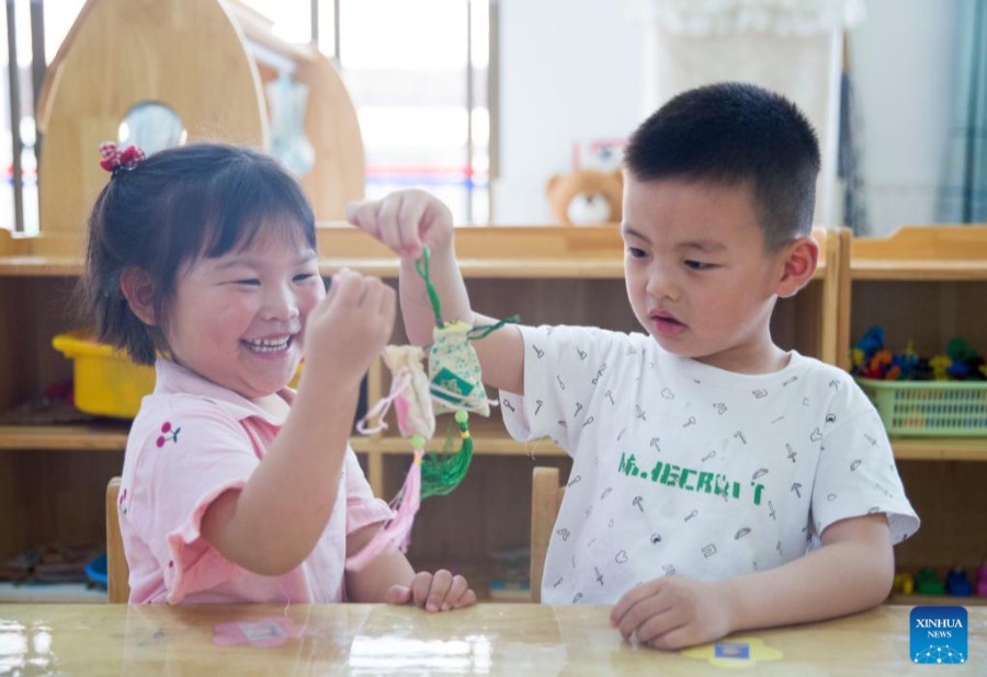 Children show their handmade mugwort sachets on the eve of the Dragon Boat Festival at a kindergarten in Duchang County of Jiujiang City, east China's Jiangxi Province, June 2, 2022. The Dragon Boat Festival will fall on June 3 this year. (Photo by Fu Jianbin/Xinhua)