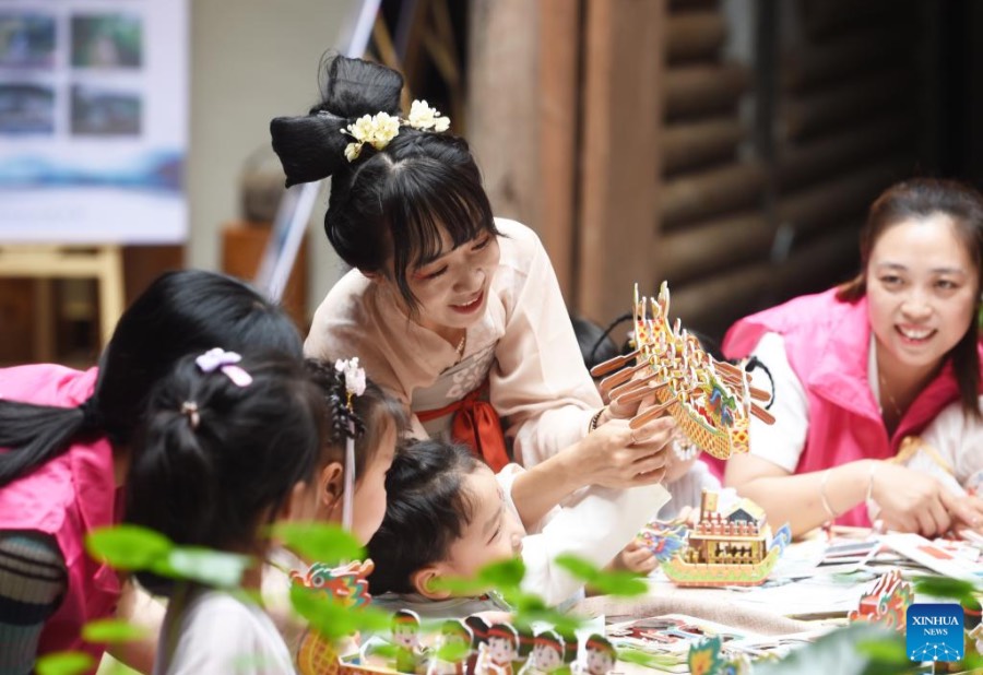 Children make dragon boat models under the guidance of volunteers on the eve of the Dragon Boat Festival at a kindergarten in Lin'an District of Hangzhou City, east China's Zhejiang Province, June 2, 2022. The Dragon Boat Festival will fall on June 3 this year. (Photo by Jin Kaihua/Xinhua)