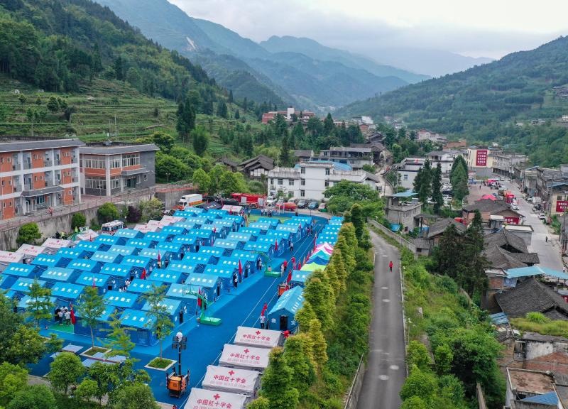 Aerial photo taken on June 2, 2022 shows a temporary shelter at a school in Taiping Town of Lushan County, southwest China's Sichuan Province.