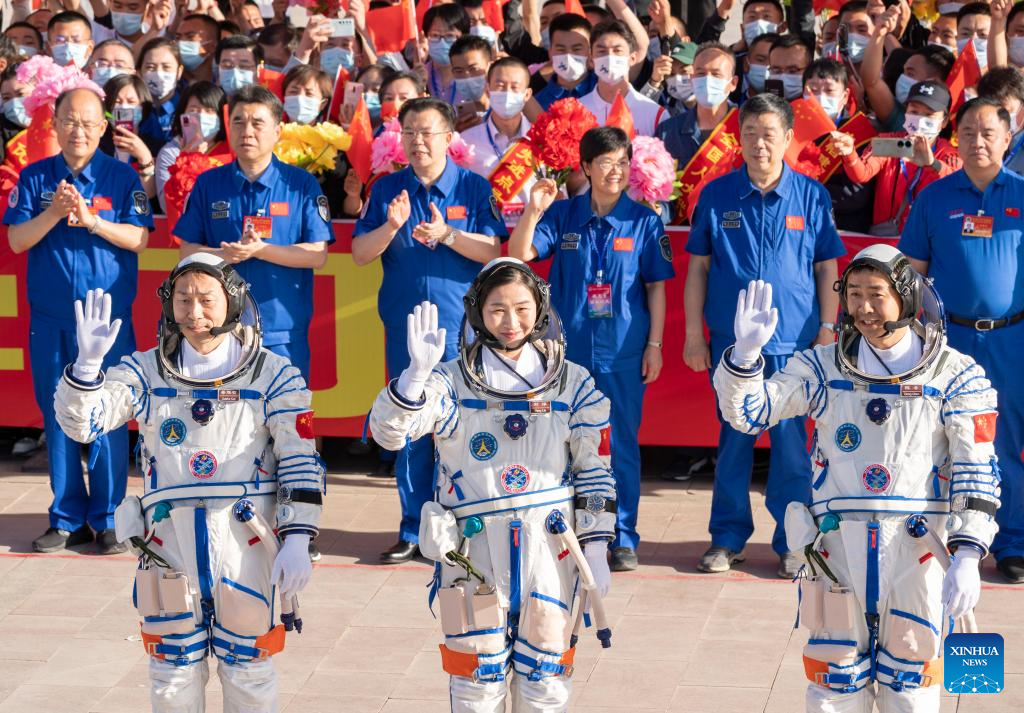 JIUQUAN, June 5 (Xinhua) -- A see-off ceremony for three Chinese astronauts of the Shenzhou-14 crewed space mission was held on Sunday morning at the Jiuquan Satellite Launch Center in northwest China.