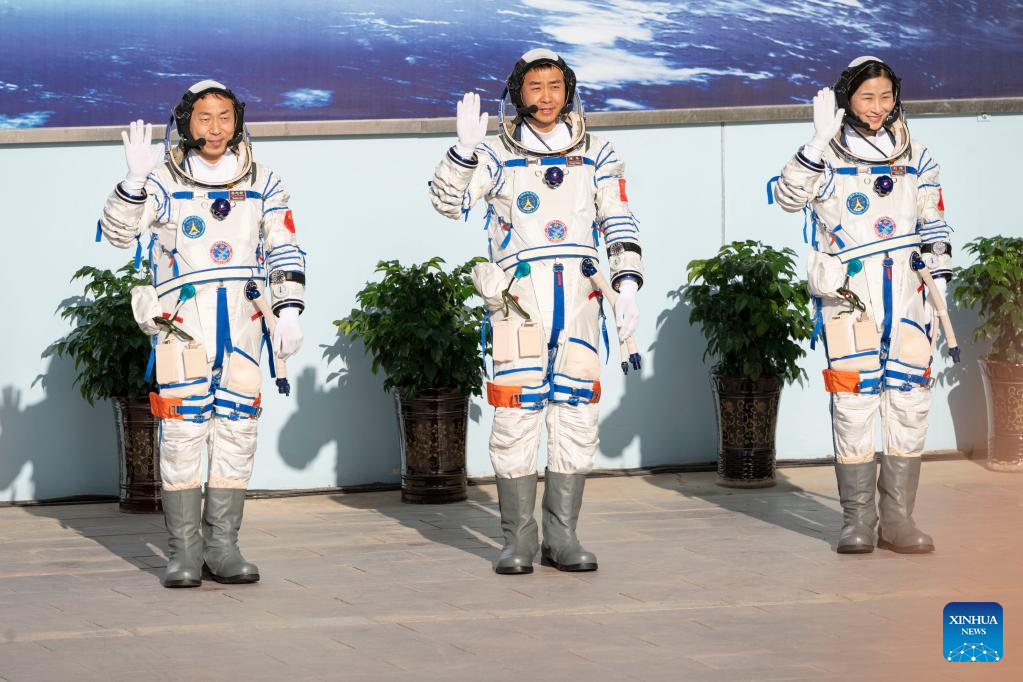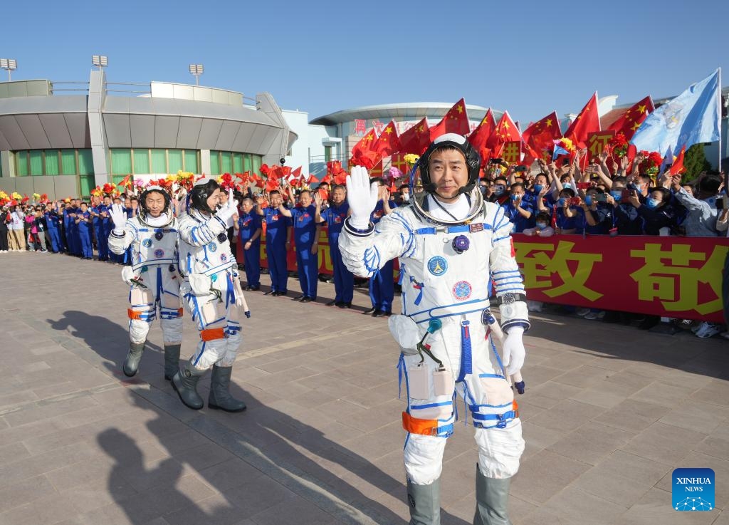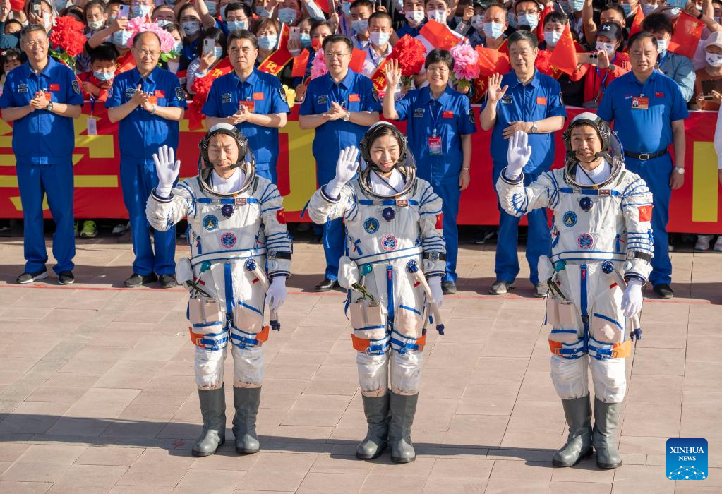 A see-off ceremony for three Chinese astronauts of the Shenzhou-14 crewed space mission is held at the Jiuquan Satellite Launch Center in northwest China, June 5, 2022. Chinese astronauts Chen Dong (C), Liu Yang (R) and Cai Xuzhe will stay in space for about six months. (Xinhua/Cai Yang)