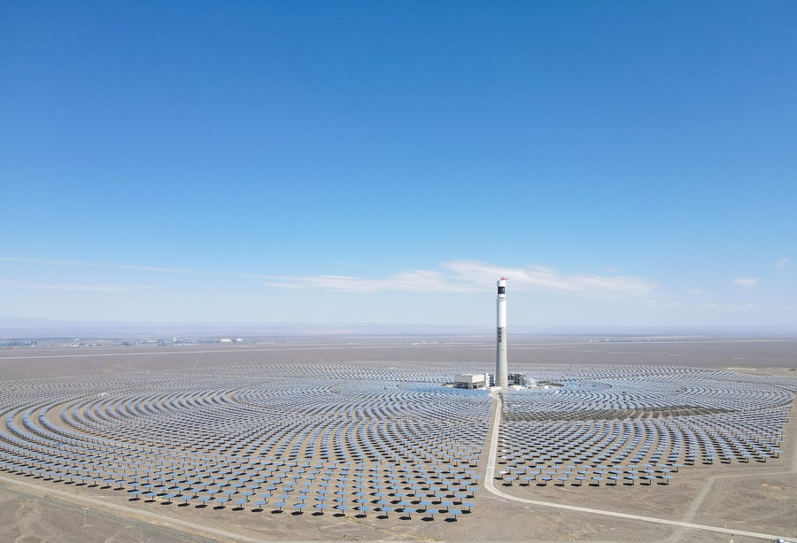 Aerial photo taken on Aug. 22, 2021 shows a photothermal power station in Hami, northwest China's Xinjiang Uygur Autonomous Region. (Xinhua/Gao Han)
