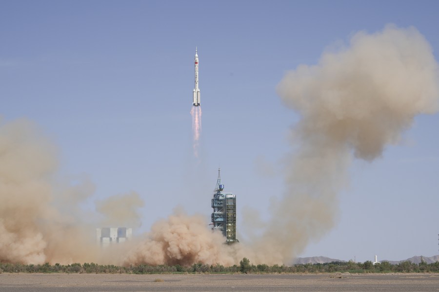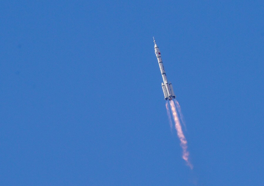 The crewed spaceship Shenzhou-14, atop a Long March-2F carrier rocket, is launched from the Jiuquan Satellite Launch Center in northwest China, June 5, 2022. (Xinhua/Lian Zhen)
