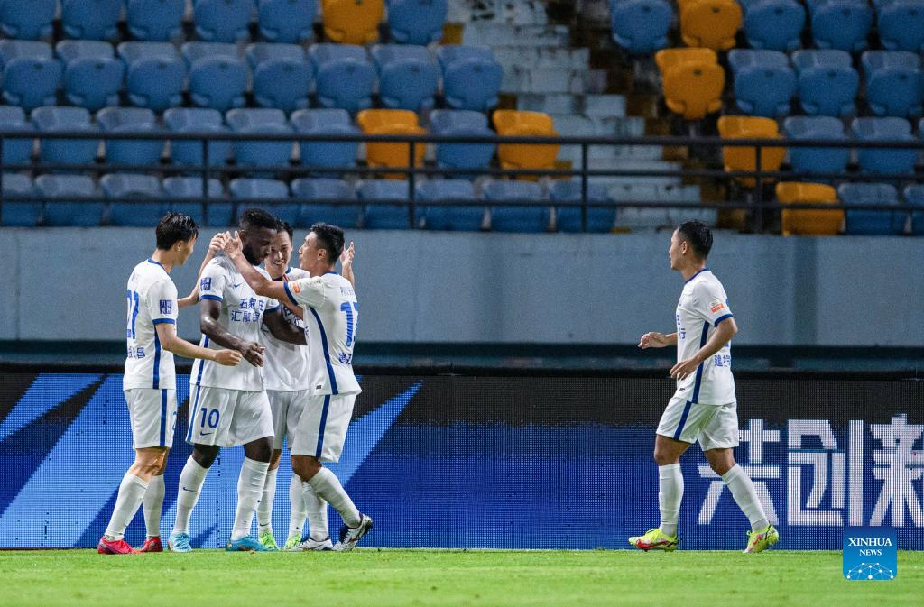 Players of Cangzhou Mighty Lions celebrate scoring during a 2022 season Chinese Football Association Super League (CSL) match between Beijing Guoan and Cangzhou Mighty Lions in Meizhou, south China's Guangdong Province, June 5, 2022. (Xinhua/Sun Fei)