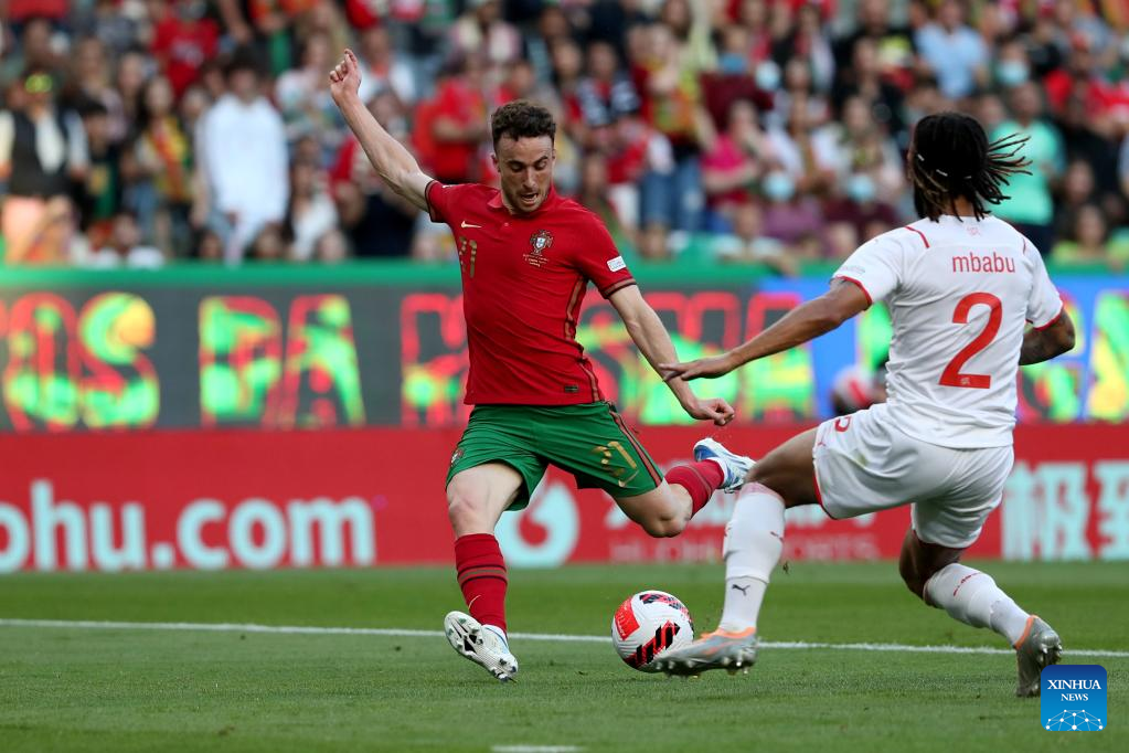 Portugal's Diogo Jota (L) vies with Switzerland's Kevin Mbabu during their UEFA Nations League football match in Lisbon, Portugal, on June 5, 2022. (Photo by Pedro Fiuza/Xinhua)
