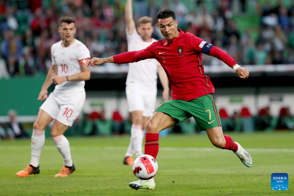Portugal's Cristiano Ronaldo shoots during the UEFA Nations League football match between Portugal and Switzerland in Lisbon, Portugal, on June 5, 2022. (Photo by Pedro Fiuza/Xinhua)