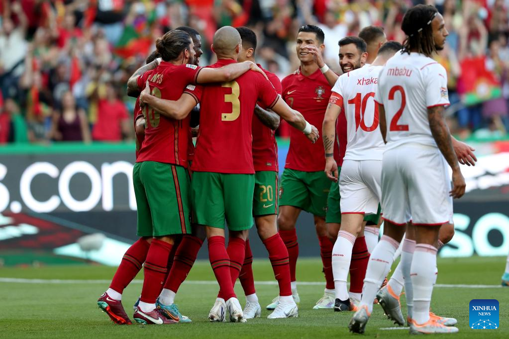 Portugal's players celebrate a goal by William Carvalho during the UEFA Nations League football match between Portugal and Switzerland in Lisbon, Portugal, on June 5, 2022. (Photo by Pedro Fiuza/Xinhua)