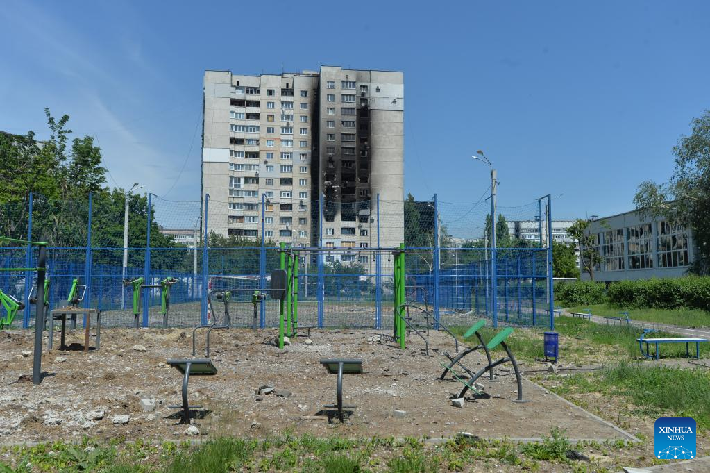 Photo taken on June 1, 2022 shows a damaged building in Kharkov, Ukraine. (Photo by Peter Druk/Xinhua)