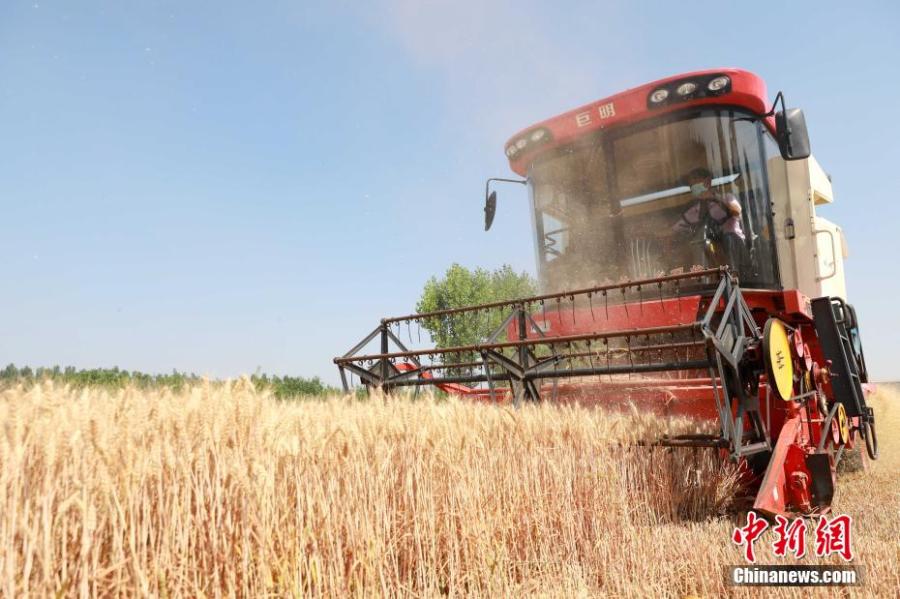 A harvester collects wheat in a wheat field in Beijie village, Xingtai, north China's Hebei Province, June 5, 2022. Farmers have started to harvest wheat in Hebei. (Photo: China News Service/Song Jie)