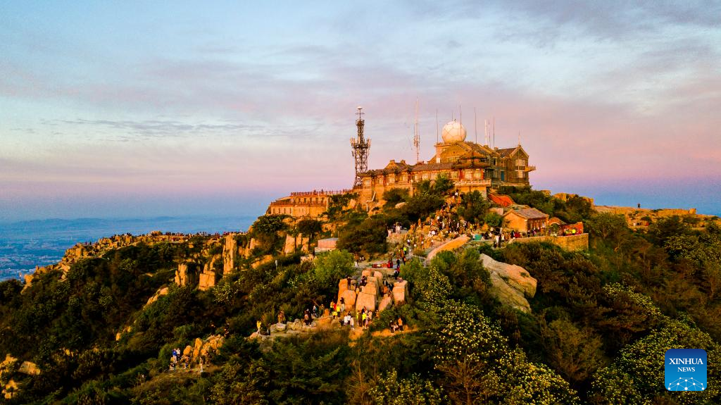 Aerial photo taken on May 26, 2022 shows tourists viewing sunrise in Mount Taishan in east China's Shandong Province. (Xinhua/Guo Xulei)