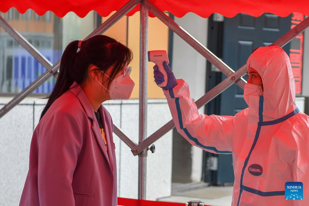 An examinee gets her body temperature checked before entering the examination site to get familiar with the enviroment ahead of the national college entrance exam in Changchun, northeast China's Jilin Province, June 6, 2022. A new high of 11.93 million students will take China's national college entrance exam for 2022, also known as "gaokao."