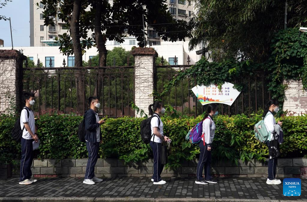 Students line up to enter the campus of Shanghai Dajing High School affiliated to Shanghai International Studies University (SISU) in Shanghai, east China, June 6, 2022.