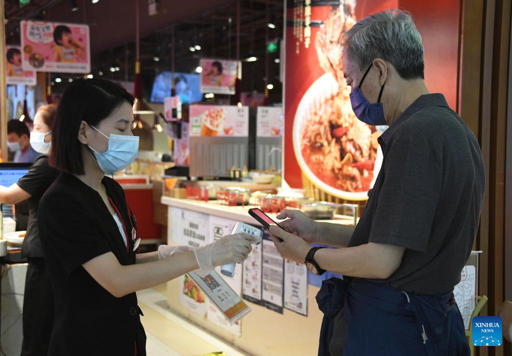 A staff member checks a customer's body temperature at a restaurant in a shopping mall of Beijing, capital of China, June 6, 2022. No new local COVID-19 infections were reported in Beijing in the 15 hours ending at 3 p.m. Monday, and no infections were registered at community level from Saturday to Monday afternoon, Pang Xinghuo, deputy head of the Beijing municipal disease prevention and control center, said at a press conference on Monday.