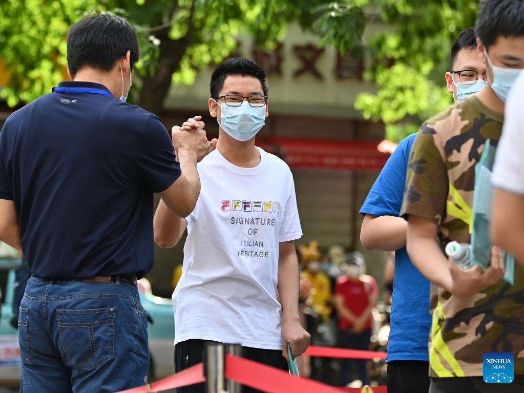 A teacher cheers for an examinee at an exam site in north China's Tianjin, June 7, 2022. China's national college entrance exam, also known as Gaokao, started Tuesday this year. (Xinhua/Li Ran)