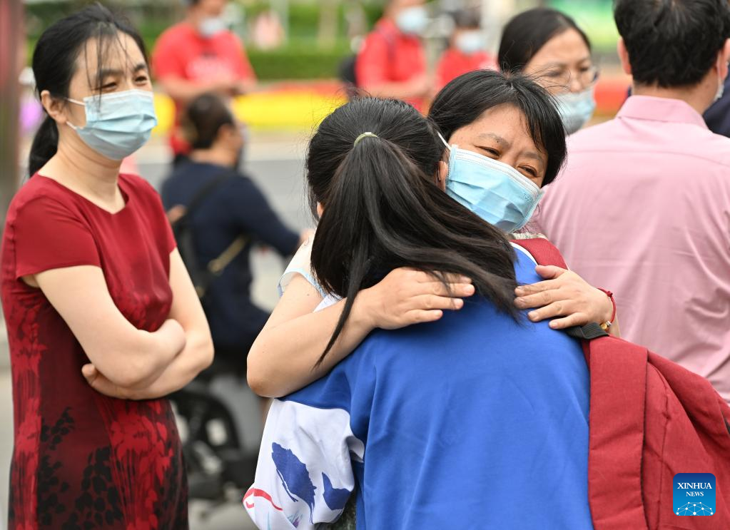 An examinee hugs her mother before entering an exam site in Beijing, capital of China, June 7, 2022. China's national college entrance exam, also known as Gaokao, started Tuesday this year. (Xinhua/Li Xin)