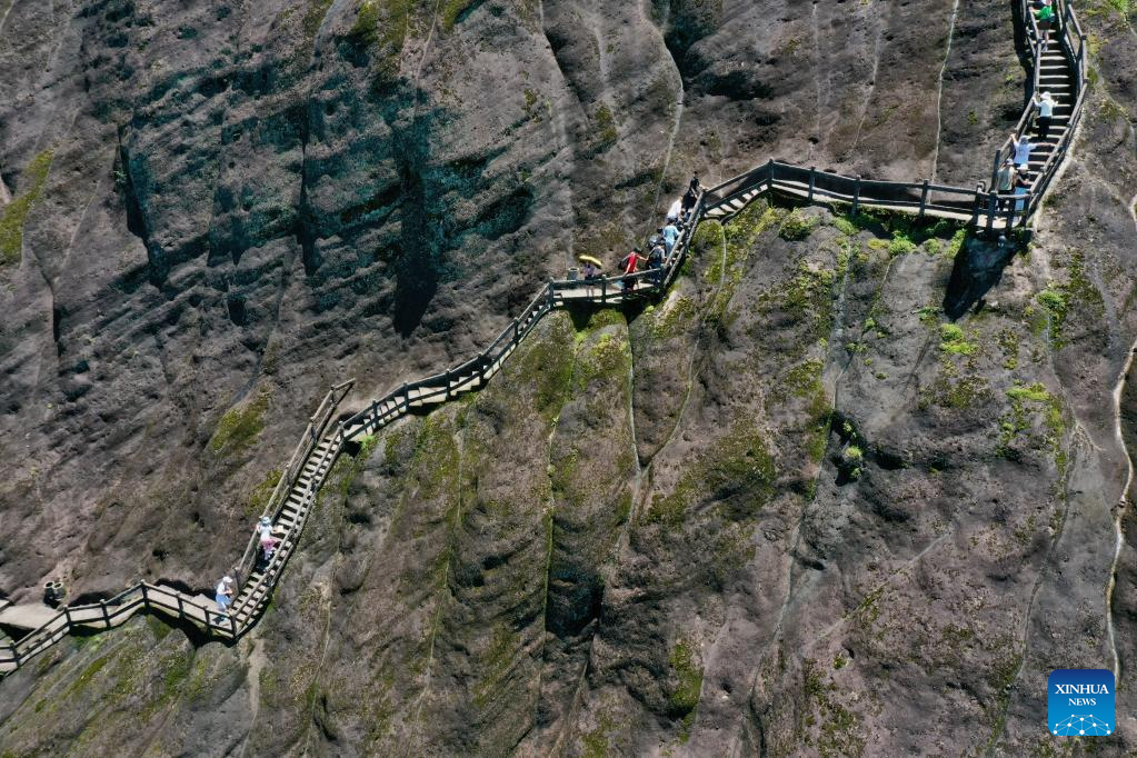 Aerial photo taken on June 6, 2022 shows tourists visiting Mount Wuyi in southeast China's Fujian Province.