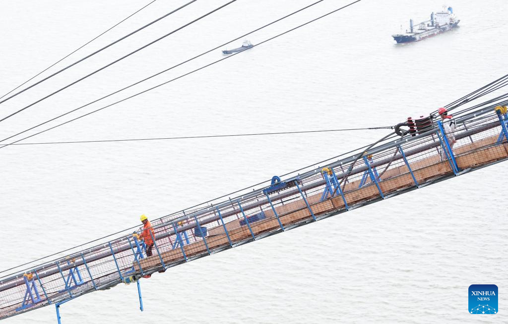 Builders work at the Lingdingyang Bridge as part of the Shenzhen-Zhongshan link in south China, June 7, 2022.