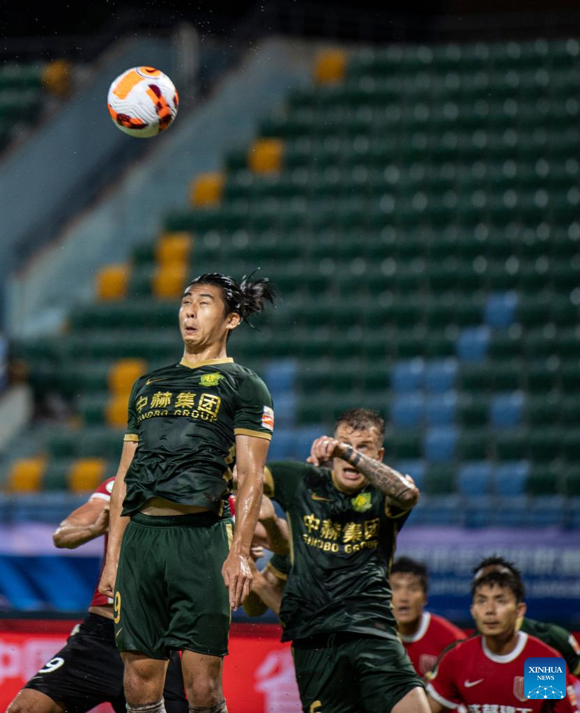 Huang Zhengyu (L) of Guangzhou City heads the ball during a 2022 season Chinese Football Association Super League (CSL) match between Dalian Pro and Guangzhou City in Haikou, south China's Hainan Province, June 8, 2022. (Xinhua/Hu Zhixuan)