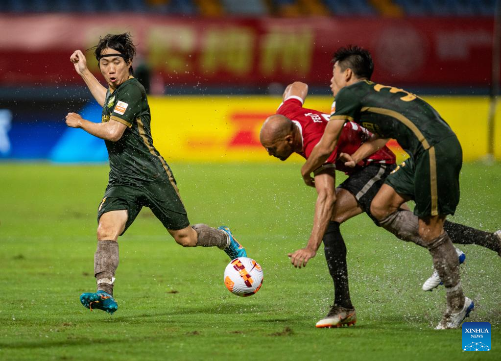 Felipe de Sousa Silva (C) of Chengdu Rongcheng competes during a 2022 season Chinese Football Association Super League (CSL) match between Beijing Guoan and Chengdu Rongcheng in Meizhou, south China's Guangdong Province, June 8, 2022. (Xinhua/Sun Fei)