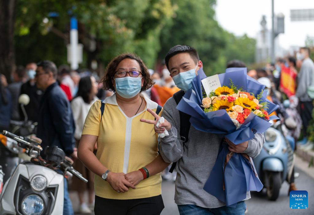An examinee (R) holding a bouquet of flowers leaves an exam site with his mother in Kunming, southwest China's Yunnan Province, June 8, 2022.