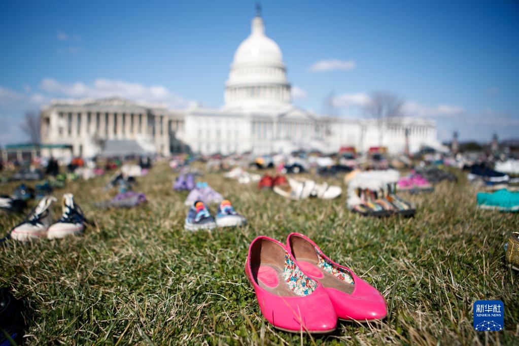 Shoes representing the children killed in school shootings since the Sandy Hook Elementary School shooting in 2012 are seen on the lawn in front of the Capitol in Washington D.C., the United States, on March 13, 2018.  (Xinhua/Shen Ting)
