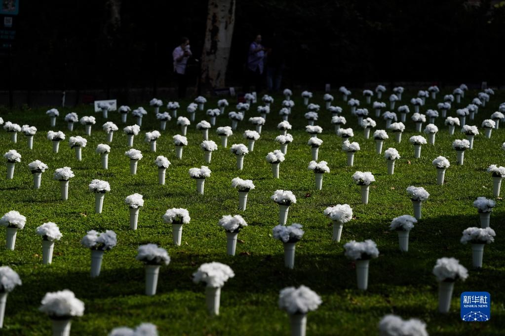 Photo taken on Oct. 8, 2021 shows the vases of flowers temporarily installed to memorialize gun violence victims at the Battery Park in New York City, the United States. According to the organizers, 1,050 vases of flowers, which represent the number of people in New York State who died from gun violence in 2020, were installed at the gun violence memorial, aiming to inspire people to fight against gun violence. (Xinhua/Wang Ying)