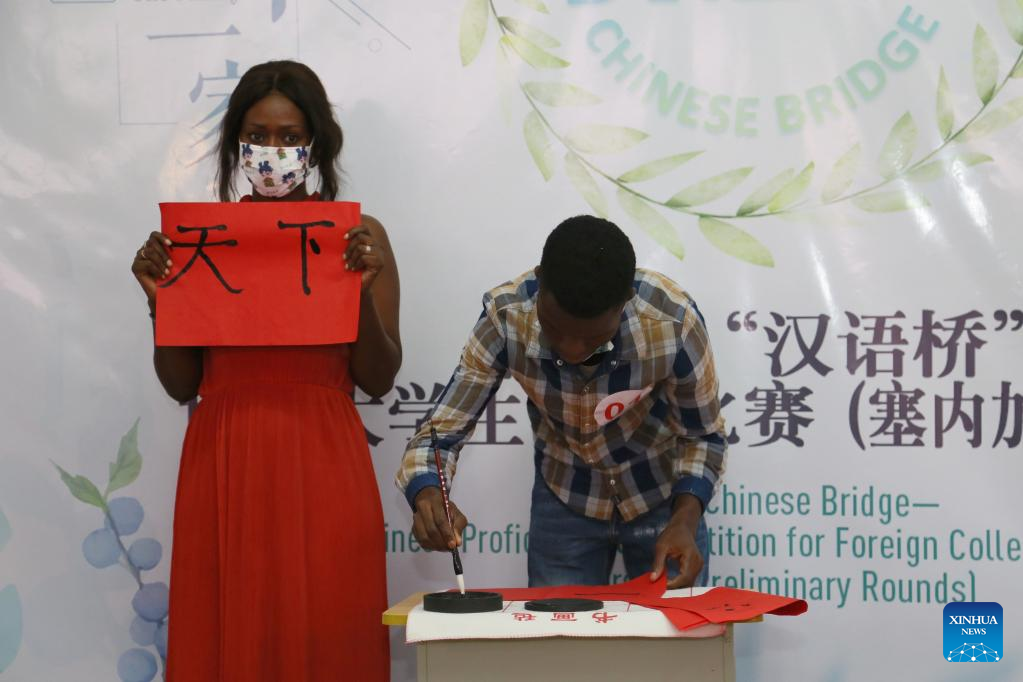 Contestants participate in the 21st "Chinese Bridge" Chinese proficiency competition for Senegalese college students at the Confucius Institute at Cheikh Anta Diop University of Dakar (UCAD) in Dakar, Senegal, June 8, 2022. Ten students participated in the contest organized by the Chinese Embassy in Senegal and the Confucius Institute at UCAD. Under the theme of "One World One Family," the final consisted of three parts: keynote speech, knowledge quiz and talent show. (Xinhua/Wang Zizheng)