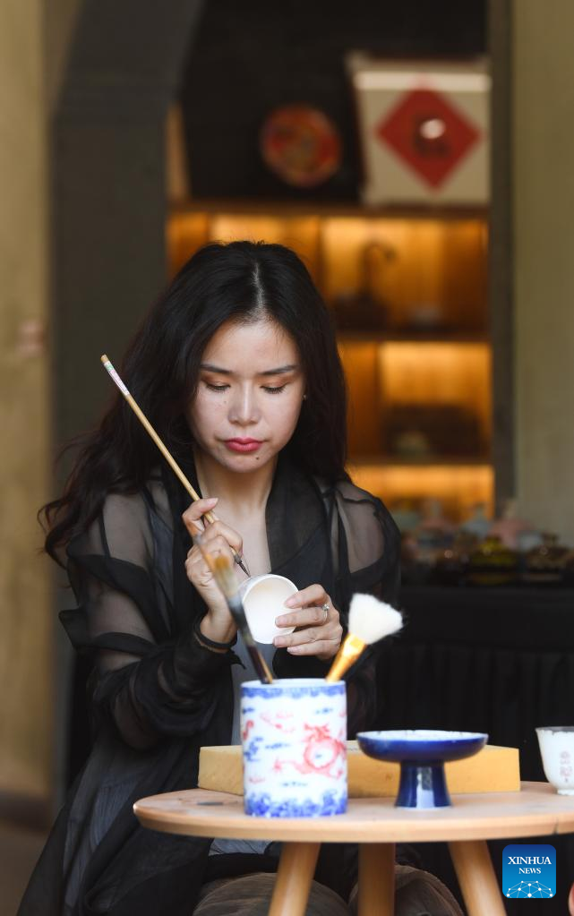Craftswoman Wang Li draws on a ceramic work at her workshop in Lucun Village, Huzhou City, east China's Zhejiang Province, May 25, 2022. (Xinhua/Weng Xinyang)