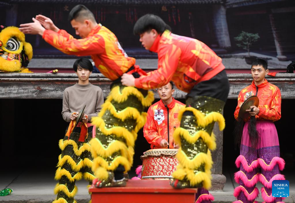 Members of a lion dance team rehearse at an ancient town in Ninghai County of Ningbo, east China's Zhejiang Province, Jan. 21, 2022.(Xinhua/Weng Xinyang)