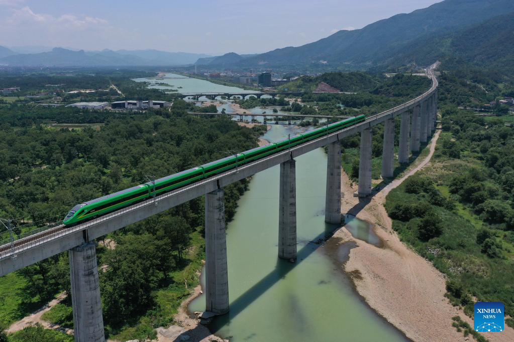 Aerial photo taken on June 25, 2021 shows a bullet train running through a bridge on Jinhua-Taizhou Railway in east China's Zhejiang Province.(Xinhua/Huang Zongzhi)