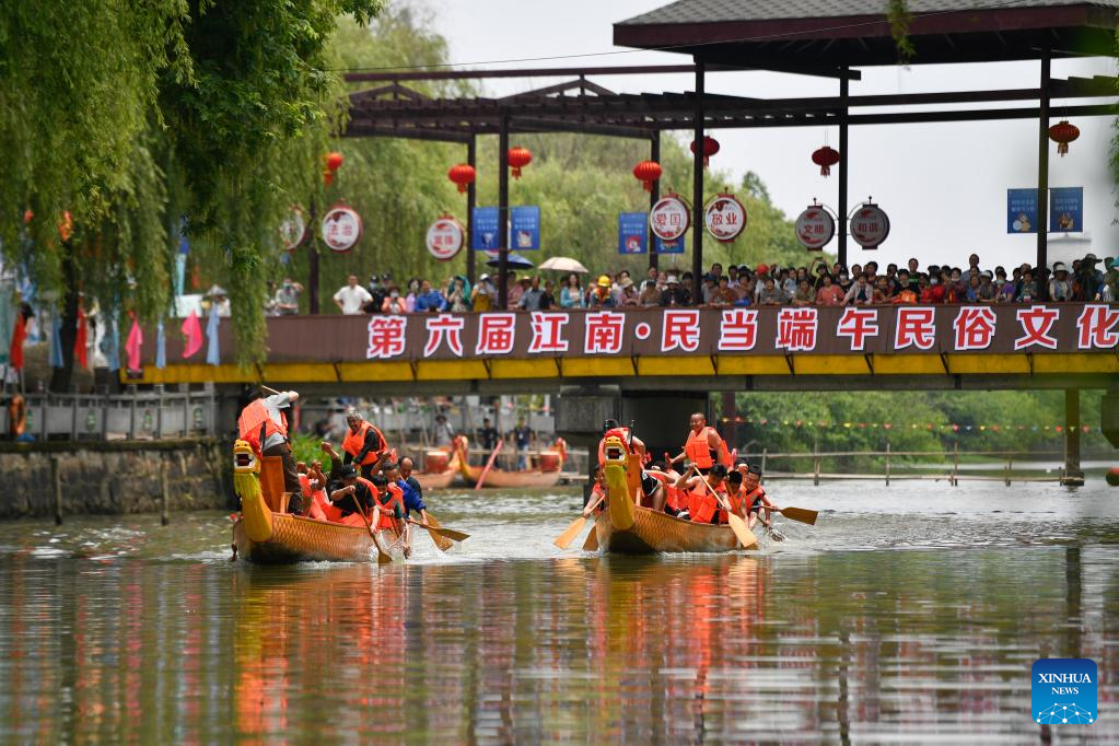 Villagers participate in a dragon boat race in Mindang Village of Huzhou, east China's Zhejiang Province, June 1, 2022.(Xinhua/Huang Zongzhi)