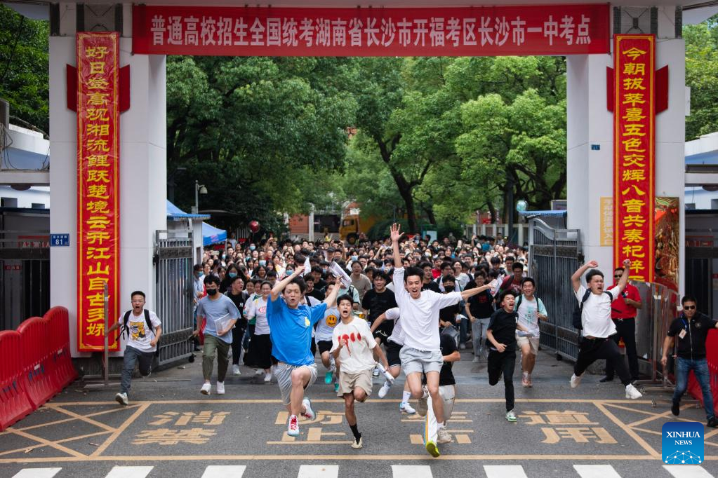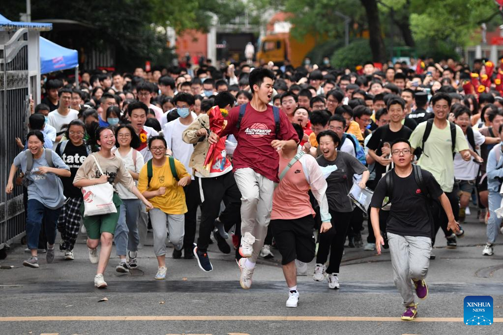 Examinees run out of an exam site of national college entrance exam in Changsha, central China's Hunan Province, June 9, 2022. The annual exam, better known as the "gaokao," saw a record 11.93 million candidates signing up this year. (Xinhua/Chen Zhenhai)