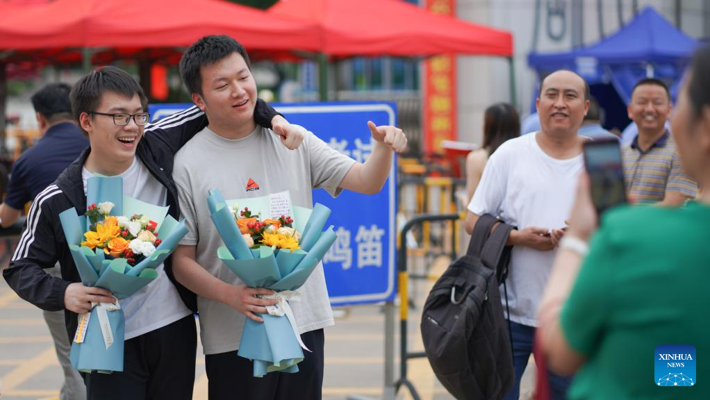 Examinees pose for a photo out of an exam site of national college entrance exam in Changsha, central China's Hunan Province, June 9, 2022. The annual exam, better known as the "gaokao," saw a record 11.93 million candidates signing up this year. (Xinhua/Chen Zeguo)