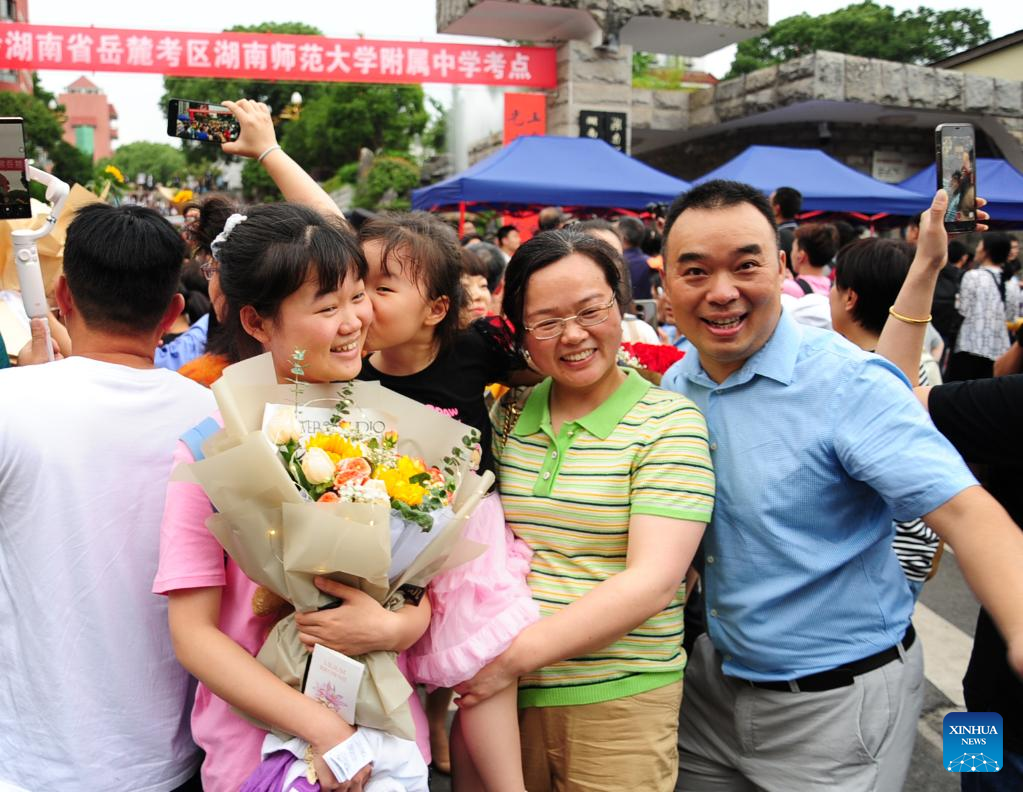 An examinee holding a bunch of flowers poses for a photo with her parents out of an exam site of national college entrance exam in Changsha, central China's Hunan Province, June 9, 2022. The annual exam, better known as the "gaokao," saw a record 11.93 million candidates signing up this year. (Xinhua/Ming Xing)